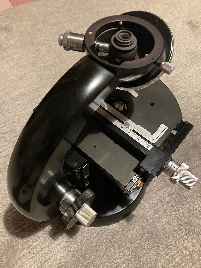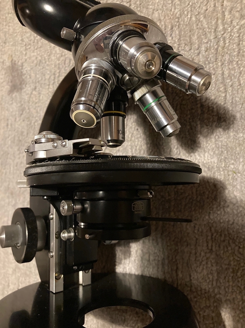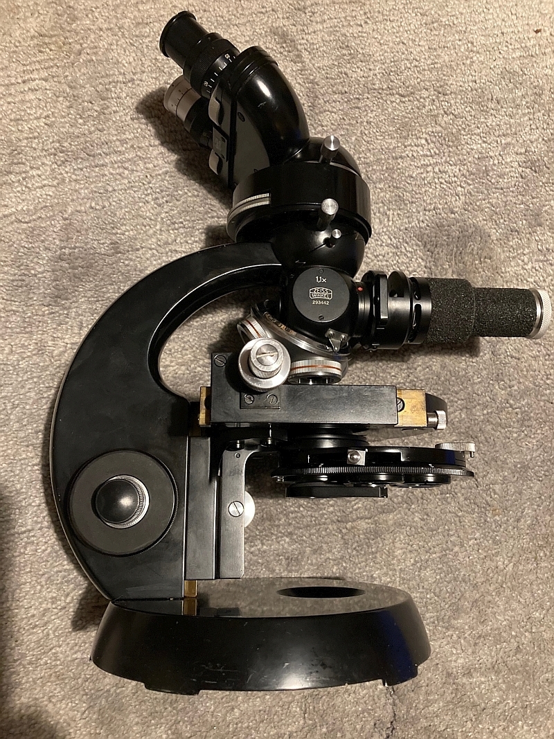 Und hier eine Variante die wohl nicht von Zeiss in dieser Form verkauft wurde, die man sich aber rel leicht "generieren" kann. Ein Junior mit einer Wechselschwalbe für den Objektivrevolver. Damit kann man dann auch Auflichteinheiten am Junior verwenden. Hier mit einer rel. frühen Zeiss Winkel Ausführung eines Auflichkondensors  (HF/DF) . Als weitere "normale" Zusatzausrüstungen noch ein Optovar (die große Ausführung - stilechter wär die kleine Form) und der für das Junior angebotene Zeiss Phasenkontrastkondensor wie er auch am Inversen GFL Planktonmikroskop zum Einsatz kam: