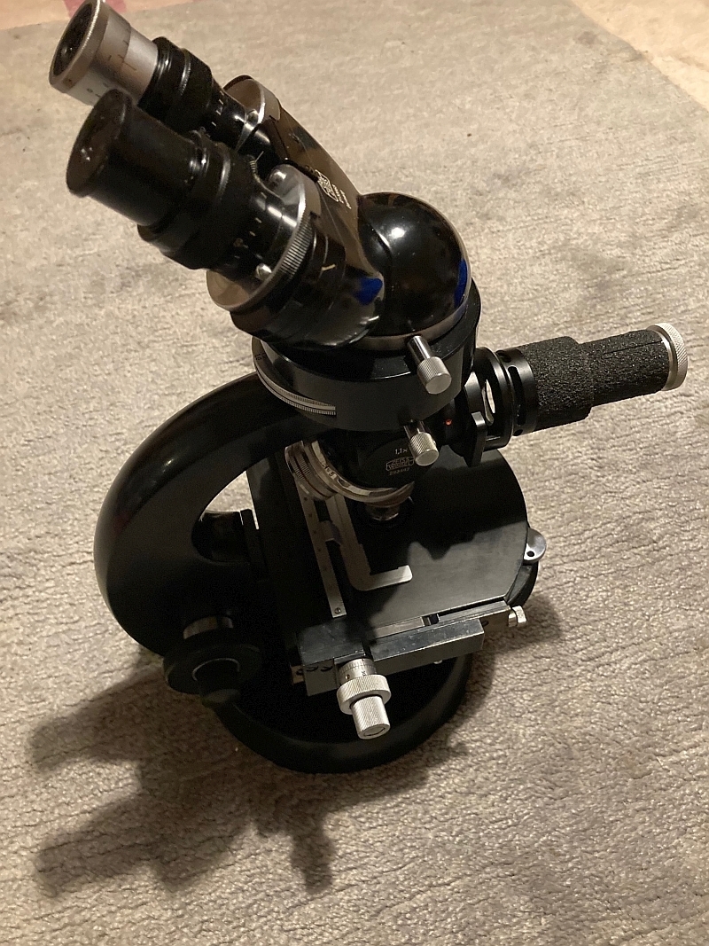 Zuerst mal das Junior mit dem Vergrößerunsgwechsler (das gezeigte Exemplar stammt aus der Geräteauflösung eines pathologischen Labors eines Kankenhauses in England. Diese Variante ist tatsächlich wohl nicht so häufig verkauft worden: