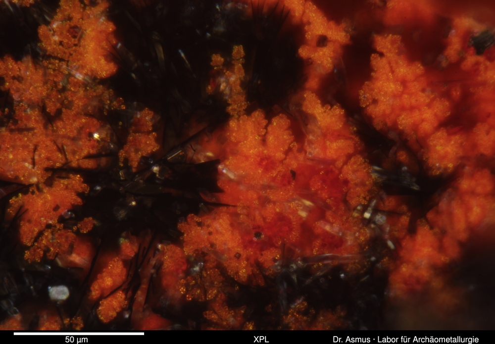Bild 3 und 4: Hier ist neben dem Kupfer und dem Cuprit auch noch Delafossit zu sehen. Delafossit ist ein Kupfer-Eisenoxid (CuFeO2), das ebenfalls gerne in mäßig oxidierender Atmosphäre entsteht. Delafossit sind die hellgrauen, leicht gebogenen Nadeln in dieser Probe. Diese Probe besteht ebenfalls aus zu Glas geschmolzenem Ofenlehm.