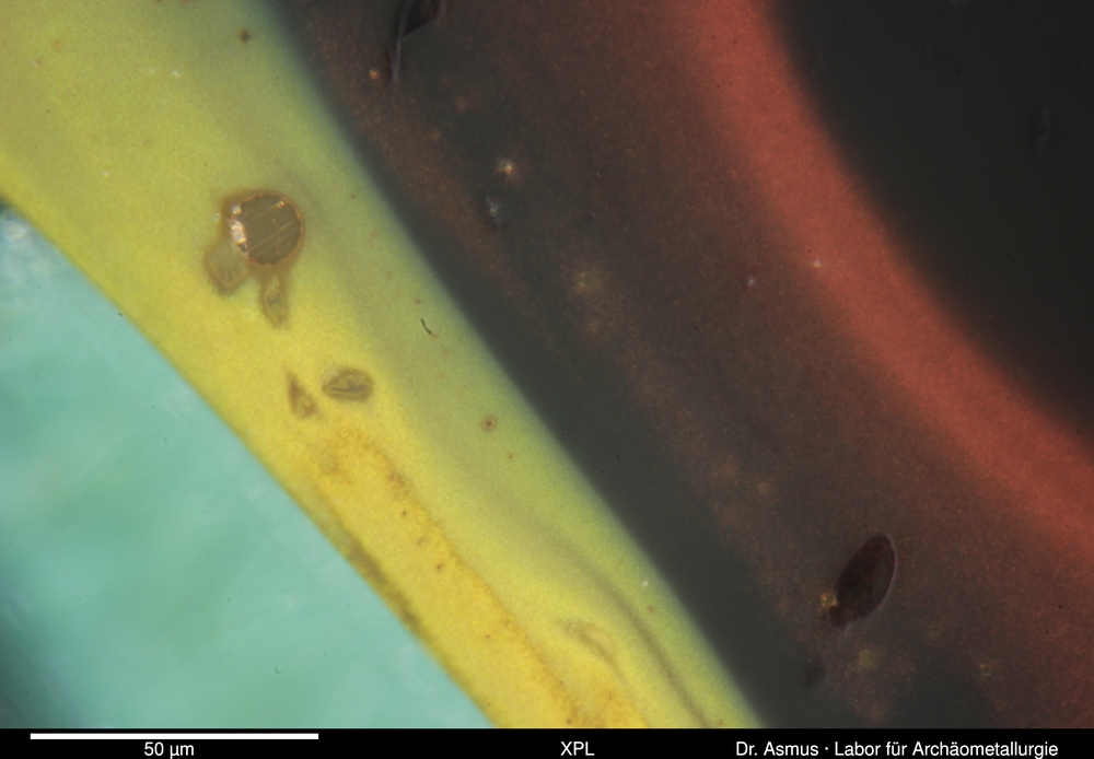 Zwei Bilder zeigen jeweils gen gleichen Ausschnitt in PPL und XPL. Bild 1 und 2: Kupfertropfen in aufgeschmolzener Ofenkeramik. Die Kupferschmelze entstand unter oxidierender Atmosphäre, deswegen die Cupritbildung in der Metallschmelze. Cuprit erscheint je nach Größe im Präparat tief rot, oder eben orange und sogar bis gelb, je kleiner es ist. Kupfer ist natürlich gut erkennbar.