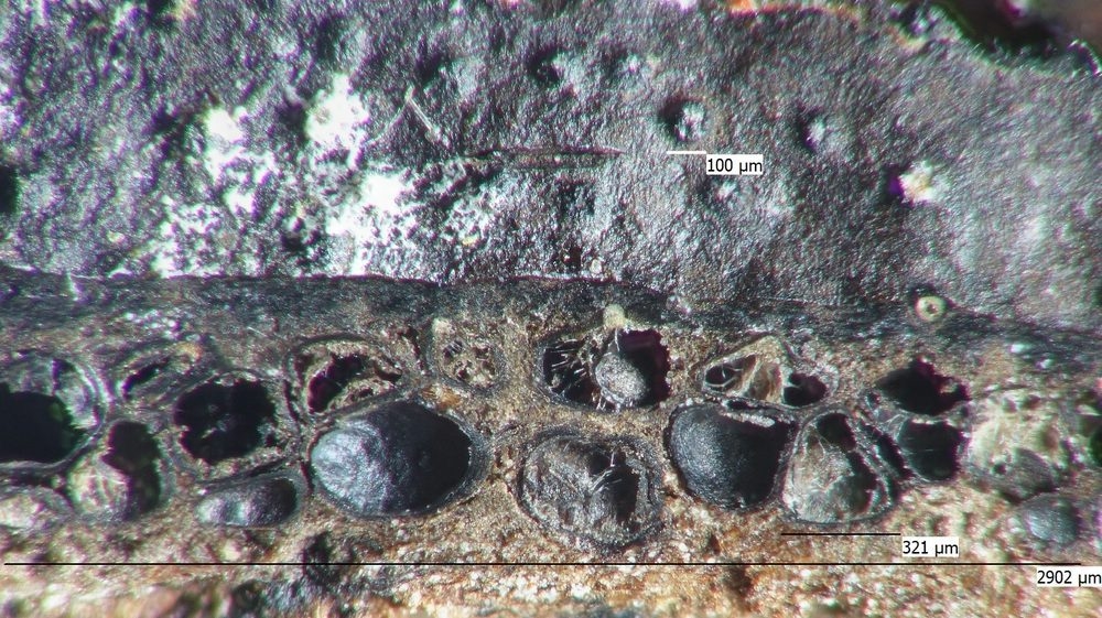 Bild 5 - Stroma-Oberfläche inkl. der ca. 200 µm breiten Perithecien der Aufsitzenden Pulstelpilze im Tageslicht ohne Diffusor, Bildbreite 2,9 mm.