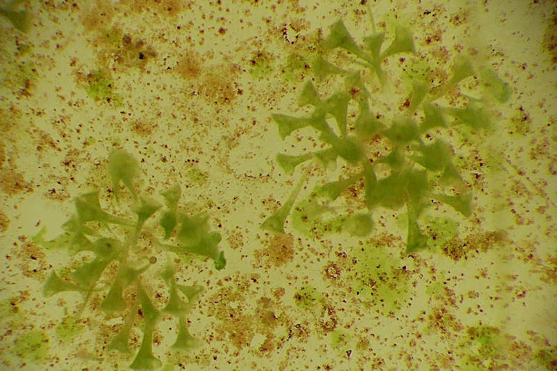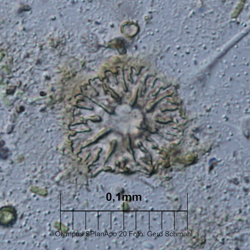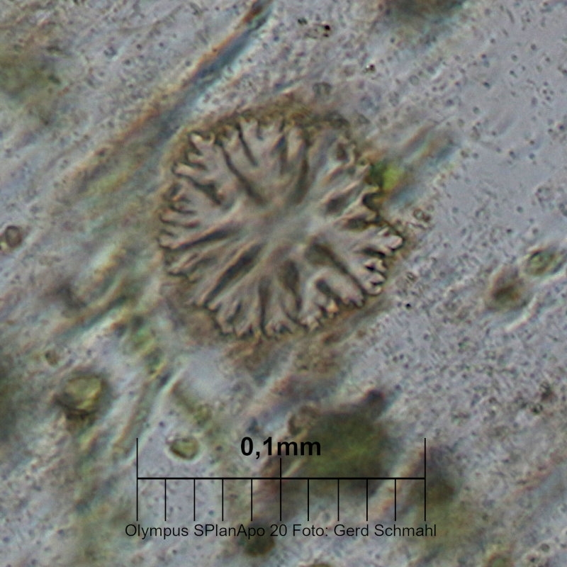 ich möchte diesen alten Faden noch einmal aufnehmen, denn ich habe nach ca. 10 Monaten die letzten Objektträger aus meiner Aufwuchsfalle entnommen und dabei ein schon etwas älteres Rätsel lösen können, für das ich bisher keine Lösung hatte. Es geht um dieser von mir "Blumenfüße" getauften Objkete, die ich nicht zuordnen konnte: