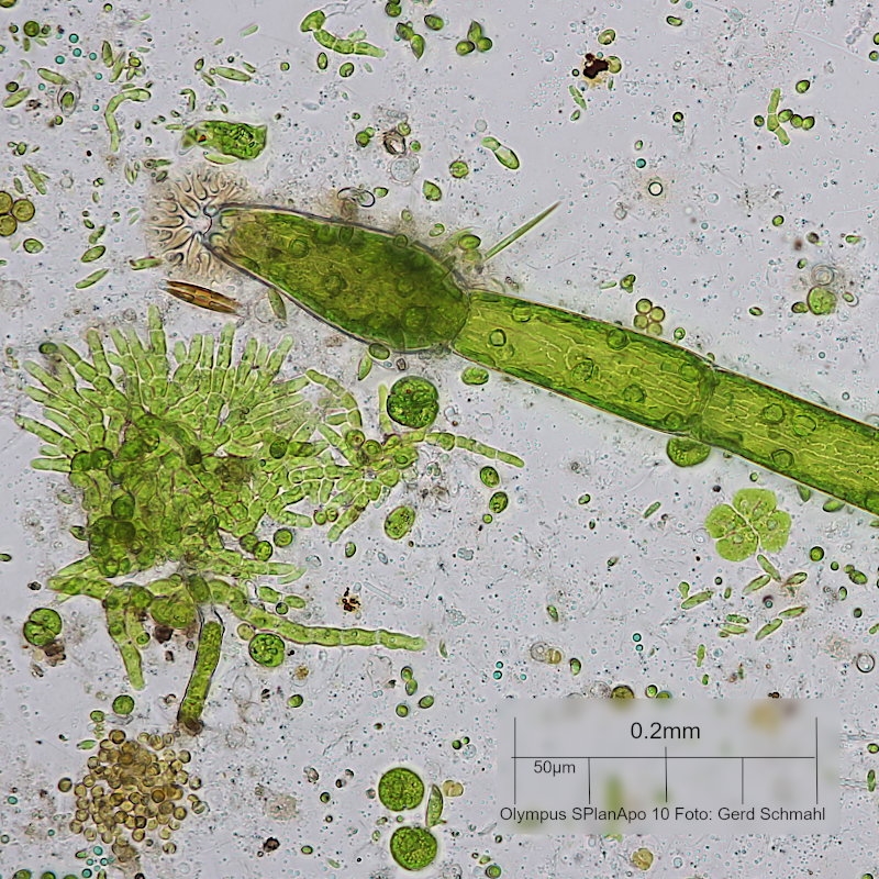 Nun habe ich endlich mal den Erzeuger gefunden: Die Kappenalge Oedogonium. Das ist nun keine sonderlich selten Alge, die ich schon oft gesehen habe, aber normalerweise bekommt man nur Fadenstücke zu fassen, bestenfalls noch mit der aufgedunsenen Ausgangszelle, aber nie den Fuß.