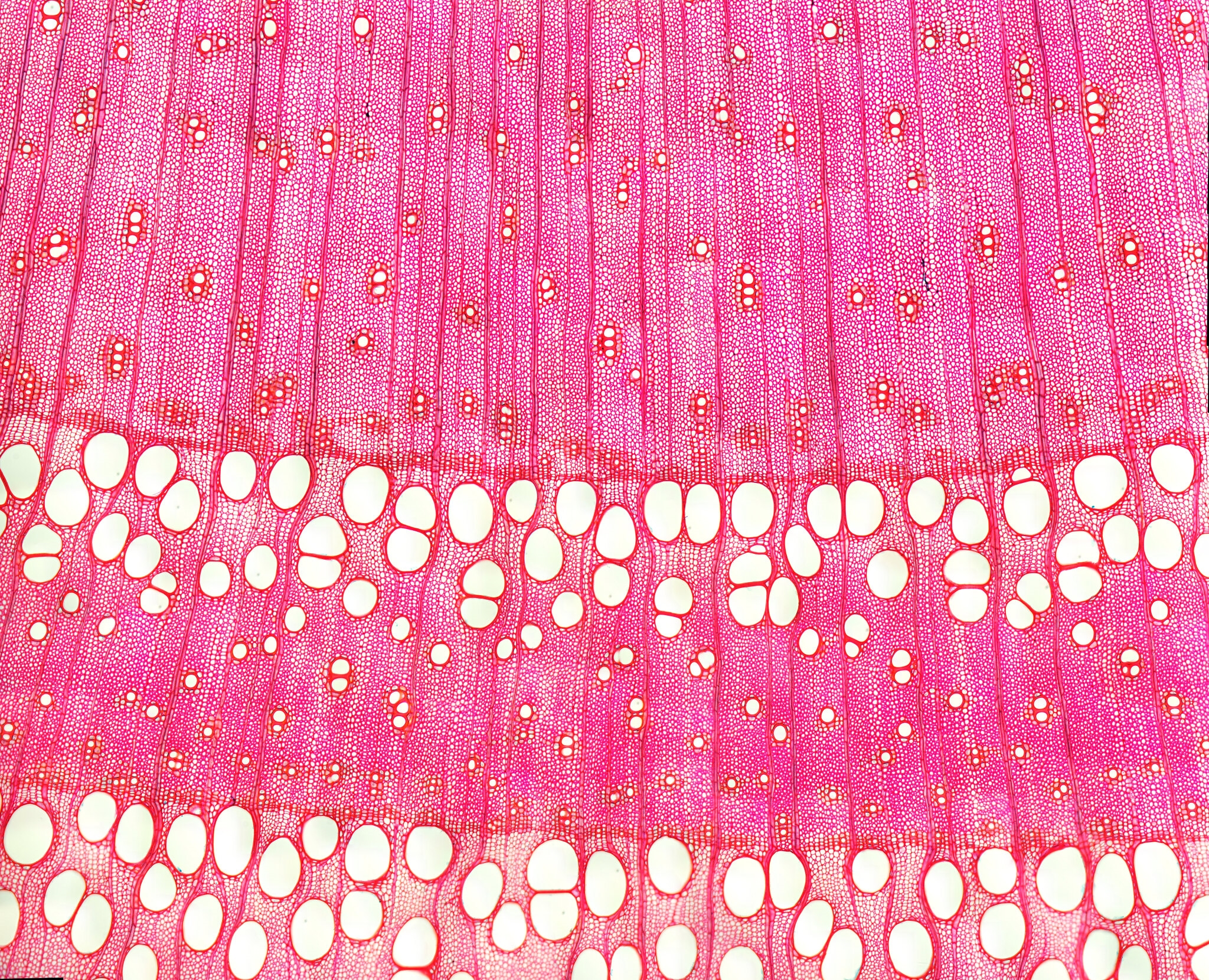 ich zeige hier zwei Aufnahmen, einen Querschnitt durch den Stamm und einen Tangentialschnitt durch die Rinde von Fraxinus excelsior.