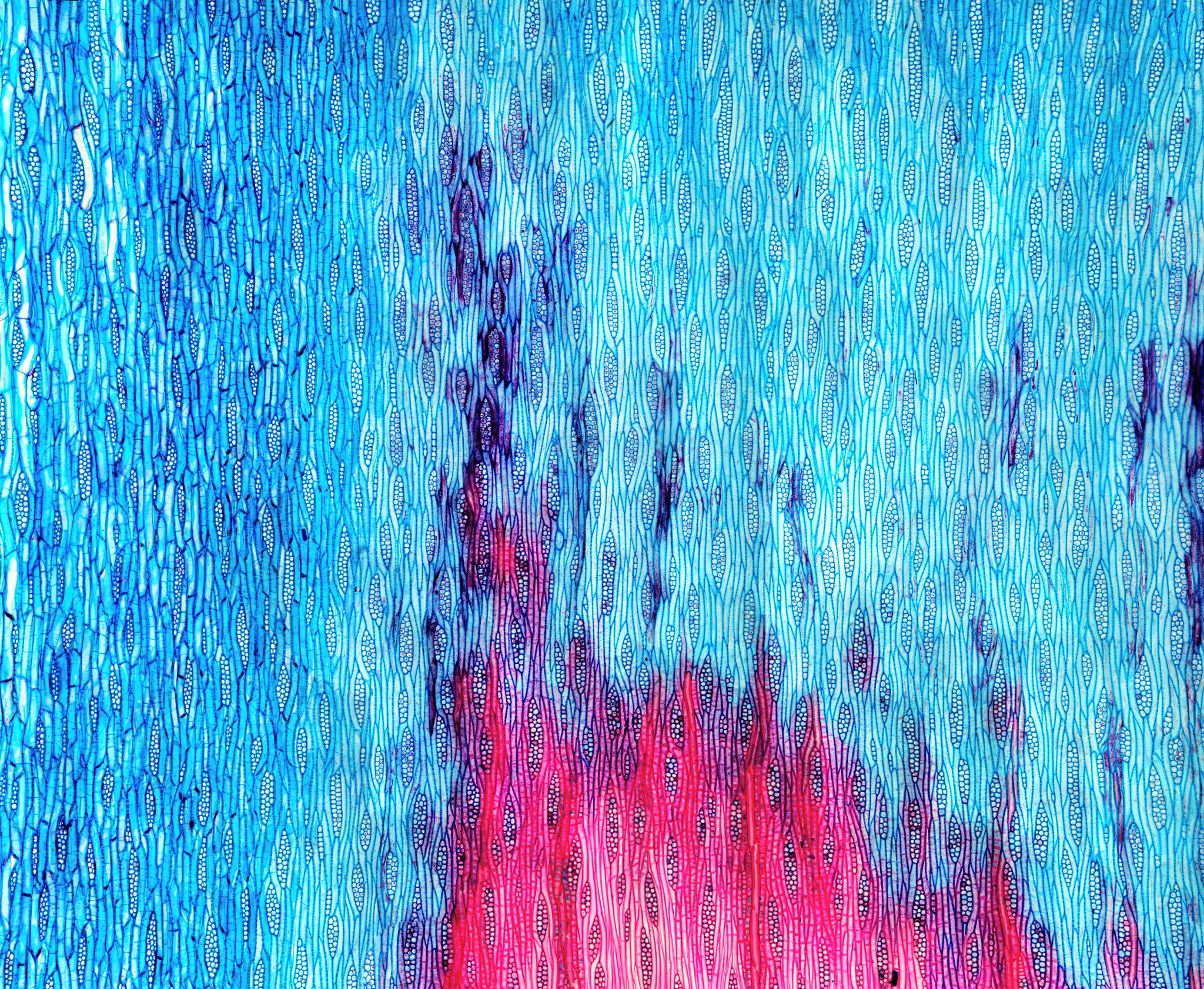 c) Der zweite Schnitt ist ein Tangentialschnitt durch die Rinde, die Rinde besteht abwechselnd aus parenchymatischen Zellschichten und sklerenchymatischen  Zellschichten. Der Schnitt läuft großteils durch eine parenchymatische Zellschicht, streift aber im roten Bereich eine Sklerenchymschicht. In der Originalaufnahme, die bei flickr liegt, können in den blau gefärbten Zellen auch schön die Zellkerne erkannt werden, die in den stark verholzten rot gefärbten Zellen nicht mehr vorhanden sind. Dazu ist es aber erforderlich, das Originalbild von flickr auf den eigenen Rechner herunterzuladen und zu öffnen, hineinzoomen so weit ist auf der flickr-Plattform leider nicht möglich.