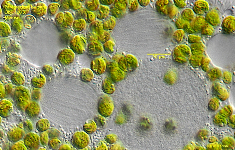 @pschmidt: Dein Bild zeigt die Konjugation eines hypotrichen Ciliaten. Wie Du sagst, sieht man nur die Makronuklei. Um auch die Mikronuklei und die eventuell eingetretene Meiose sehen zu können, hättest Du die Schichtdicke wesentlich verringern müssen. Insbesondere wenn sich auch noch viele Nahrungsvakuolen oder Reservekörper im Plasma befinden (oder Chloroplasten bei P. bursaria), hilft nur platt machen.