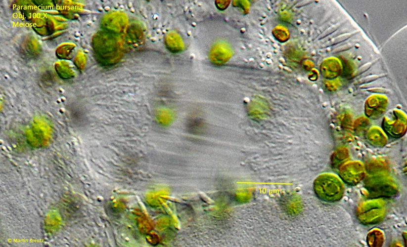 Der Prozess ist also dynamisch. Eine komplette Beobachtung des gesamten Ablaufes am lebenden Objekt ist bei Paramecium bursaria ausgeschlossen, weil man die Zellen stark pressen muss, um zu erkennen, was unter der Schicht aus Zoochlorellen passiert. Ich habe also viele Zellen untersucht und dann versucht aus den Einzelbefunden den Vorgang zu rekonstruieren, was natürlich ein gewagtes Unterfangen ist.