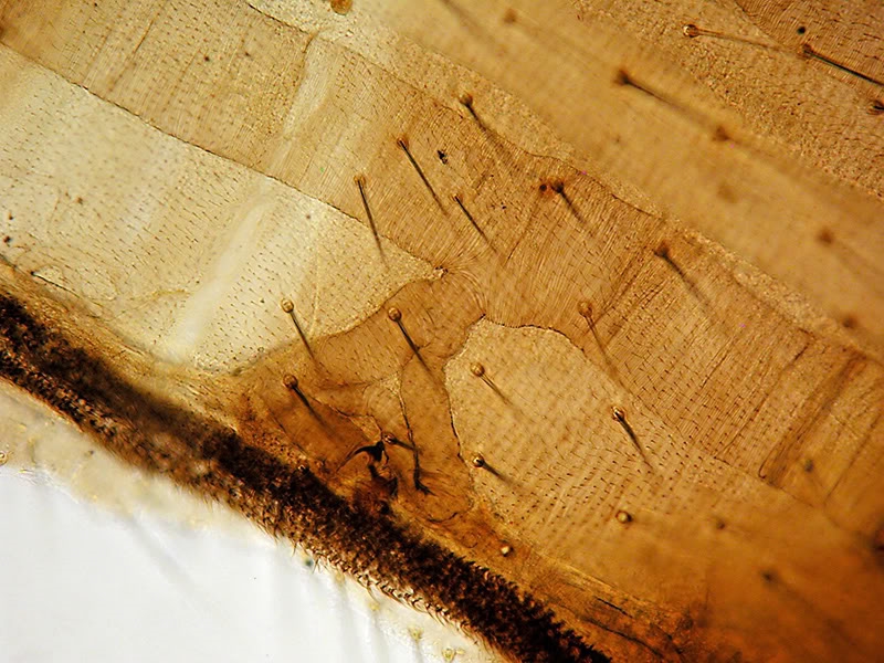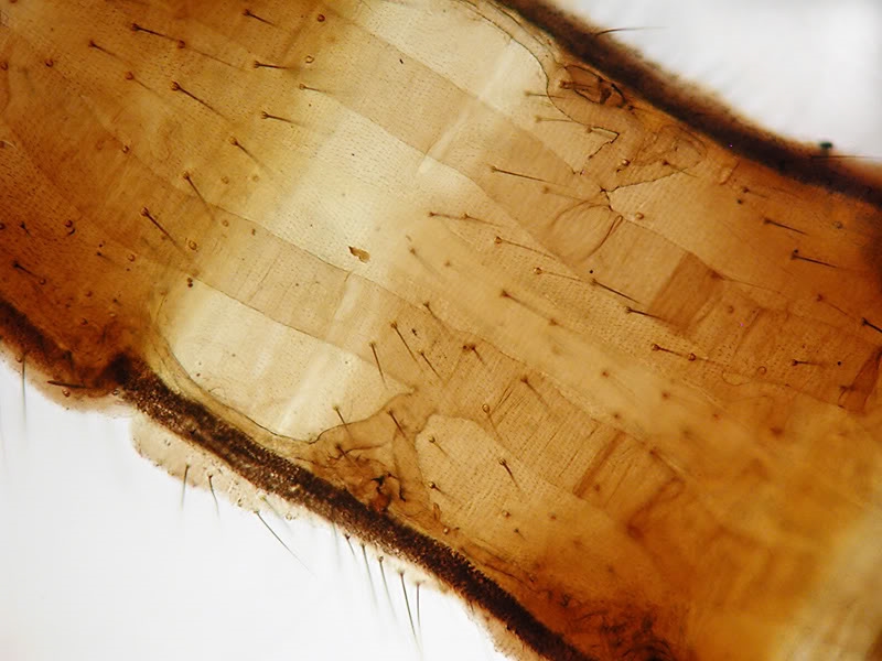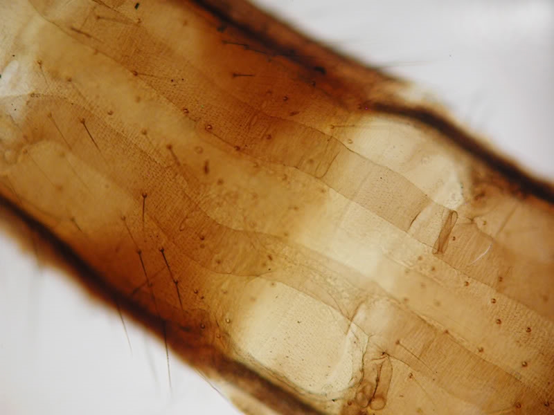 An dieser Mücke hatte ich testen wollen, ob einlegen in Nelkenöl was bringt iin puncto auhellen. Das Tier lag also fast drei Wochen in dem Öl und nach Einschluss in künstlichem Kanadabalsam konnte man schöne Einzelheiten des Thorax erkennen. Insbesondere die Tracheen mit ihren Verzweigungen hatte ich noch nie so klar gesehen.
