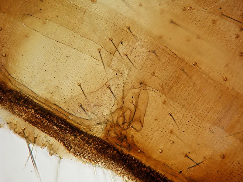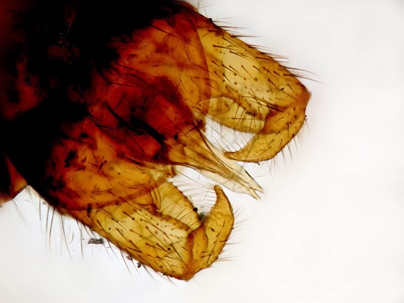 Und als Zugabe noch das Abdomen des Tieres. Ich halte das für eine männliche Phallusanlage mit den zwei Parameren und dem Aedeagus in der Mitte. Falls das Nonsense ist, bitte ich die Insektenspezialisten sich auf mich zu stürzen  ;D