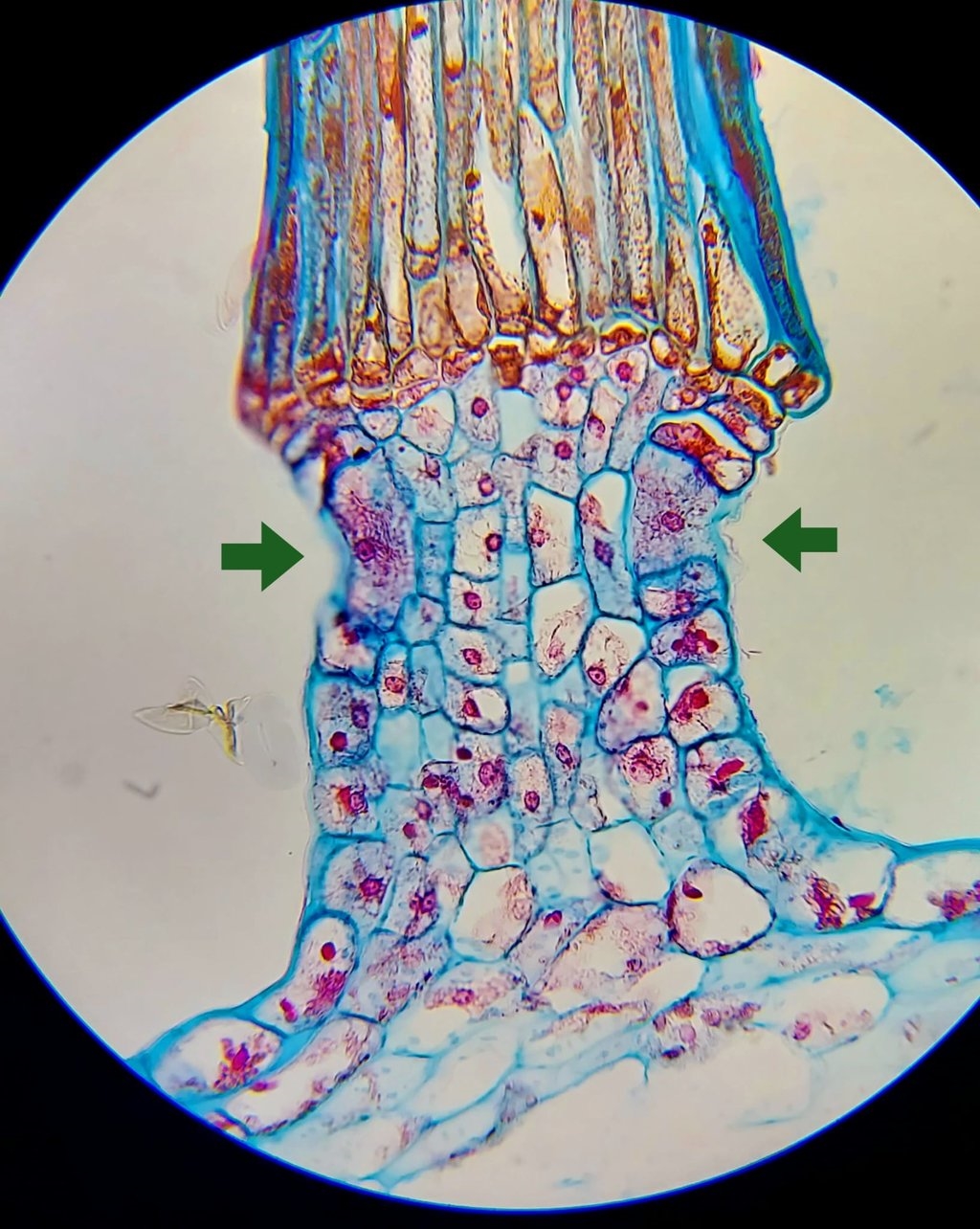 Spaltöffnungen und Chloroplasten an der Außenseite der Blätter.