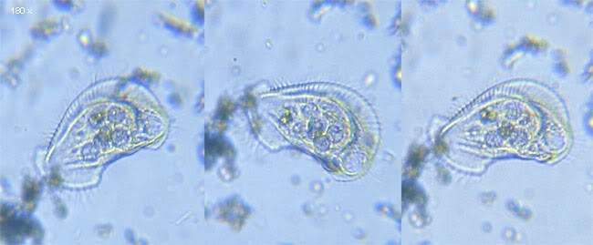im Moment bin ich mit den Zeichnungen im Streble-Krauter noch überfordert, deshalb frage ich lieber Euch. Das folgende Wimpertierchen fand ich ebenfalls in einer feuchten Moosprobe. Es verharrt lange an einer Stelle und ist im Vergleich zu den anderen Exemplaren recht groß. Da die Qualität der Aufnahmen Wünsche offen lässt, habe ich drei Fotos zusammengestellt. Vielleicht lässt sich bestimmungsmäßig ja etwas machen ...