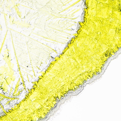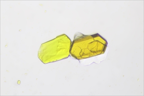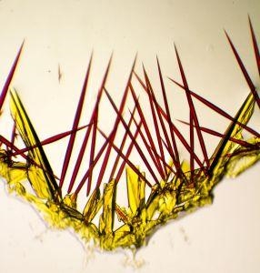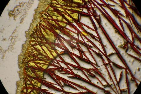 @ Reinhard - ich habe nochmal Versuche mit verschiedenen Mischungsverhältnissen gemacht. Diese Nadeln erhalte ich allerdings nicht, jedenfalls nicht in der reinen Form, wie auf deinen Aufnahmen. Lasse ich nur das CuCl2 eintrocknen, oder nur das CsCL, so ergeben sich jeweils farblose Strukturen, die sich aber in der Form deutlich unterscheiden. Alle Gemische führen zu hellgelben bis bräunlichen Kristallisationen. Diese sehen zu Beginn der Kristallisation (noch Flüssigkeit auf dem OT) aus, wie auf dem Bild unten. Nach dem vollständigen Trocknen ergeben sich Bilder, ähnlich dem letzten Bild in #29.