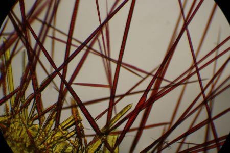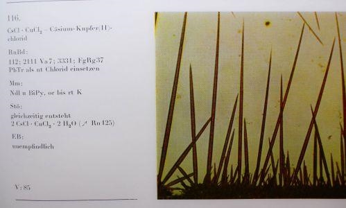 (gelbbraune) Kruste erkenne, kühle ich auf dem Metallfuß des Mikros schnell wieder ab. Dann entstehen beim weiteren Eintrocknen im "Nest" aus gelben Kristallen die tiefroten Nadeln des CuCl2-CsCl.
