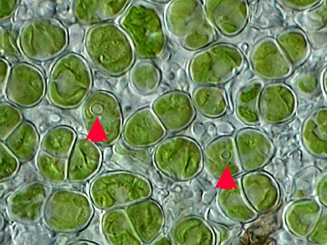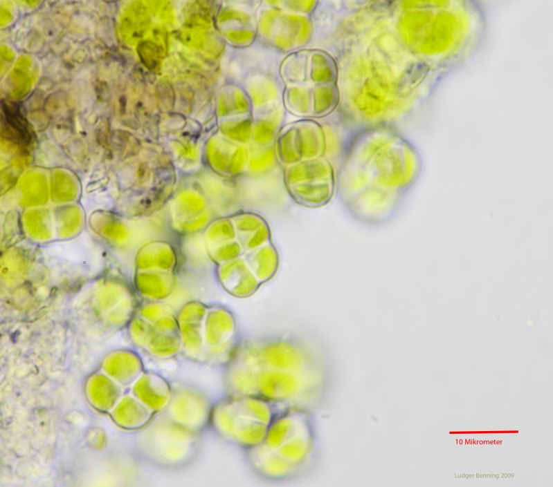 Die Gebilde stimmten nicht mit den Algen der Flechten überein.  Im " Das Leben im Wassertropfen " ( 8. Auflage / 1988 ) fand ich auf Seite 115, Abbildung 10 die Blaualge  Chroococcus turgidus . Stimmt meine Bestimmung ? Ich wundere mich, die Alge auf einem Heckenzweig gefunden zu haben.