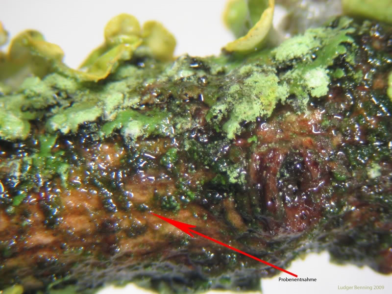 Unter dem Stereomikro fielen mir grüne Inseln auf, die ich zuerst für " Ausläufer " der Flechten hielt. Bei der Probenentnahme zeigte sich, daß die grünen Inseln in einer Schleimhülle steckten.
