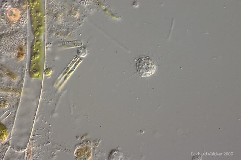 Raphidiophrys kann es meiner Ansicht nach nicht sein, da bei dieser Gattung die Tangentialschuppen die Axopodien hinaufreichen und einen "flaumigen" Überzug bilden. Soweit man auf den Bildern erkennen kann, liegen die Tangentialschuppen jedoch panzerartig um den Plasmakörper, durchbrochen von radiär abstehenden Radiärskleriten. Letztere sind schwach gekrümmt und schwach entwickelt. Das muss dann die Gattung Acanthocystis sein. Die Art ist schwieirig zu bestimmen, evtl. A. erinaceus (s. auch PM, Vol. 3, S. 118, Abb. 3).
