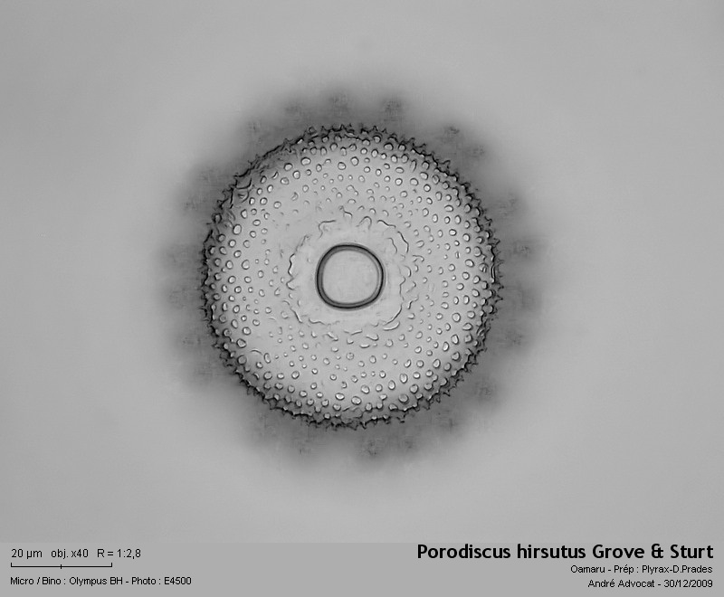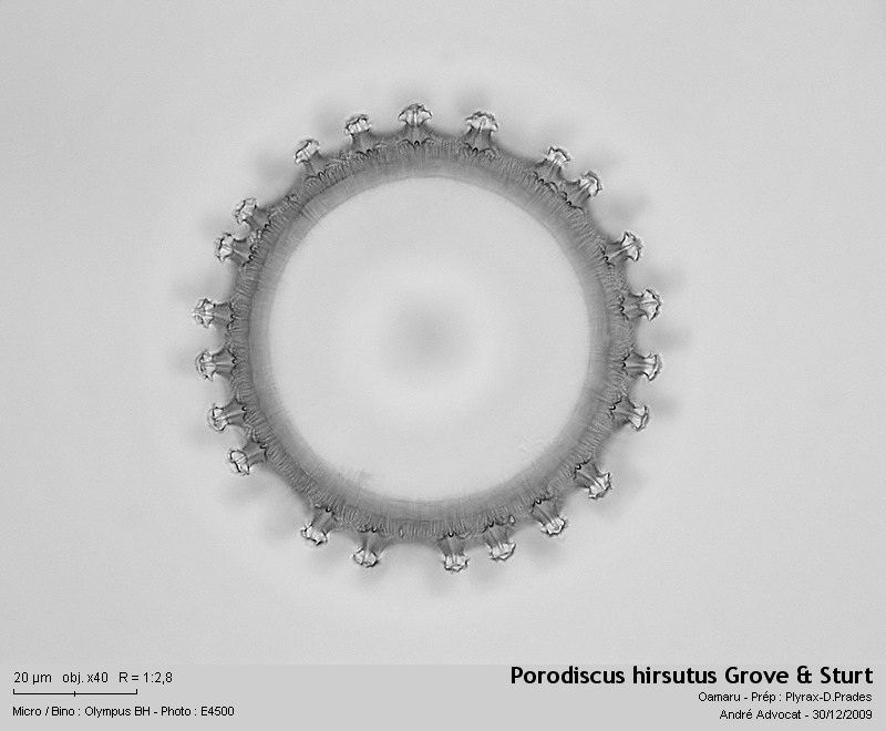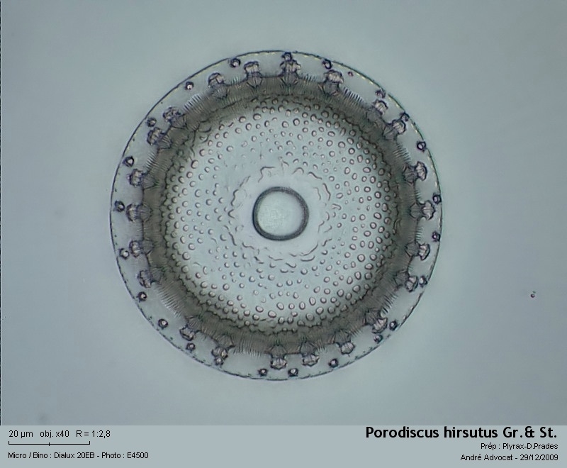 Aus Oamaru (Neuseeland) herkommend, ist Porodiscus hirsutus eine fossile marin  Diatomee.