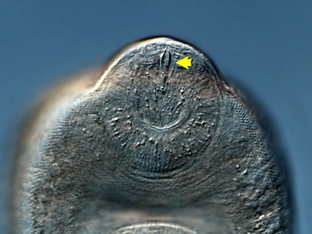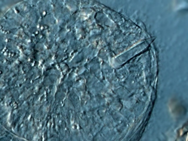 Der Bohrstachel wird offensichtlich dazu benutzt, in den Zwischen- bzw. Endwirt einzudringen. Diesen Stachel   konnte ich bei meiner Larve finden: