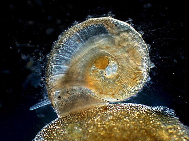 Wo kommt die Larve her? Typische Wirte sind Mollusken, in diesem Fall könnten Wasserschnecken als Zwischenwirte in Frage kommen. In derselben Probe befand sich eine Schneckenart, von der ich ein junges Exemplar beim Grasen an einem Wasserlinsenblatt fotografieren  konnte. Möglicherweise handelt es sich um eine Gyraulus- Art (?? G. crista?? wegen der ,,Dornen" am Gehäuse ???)