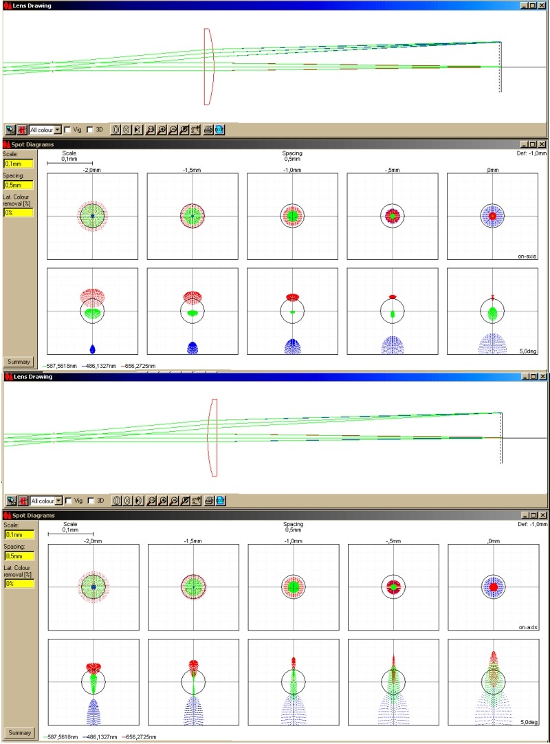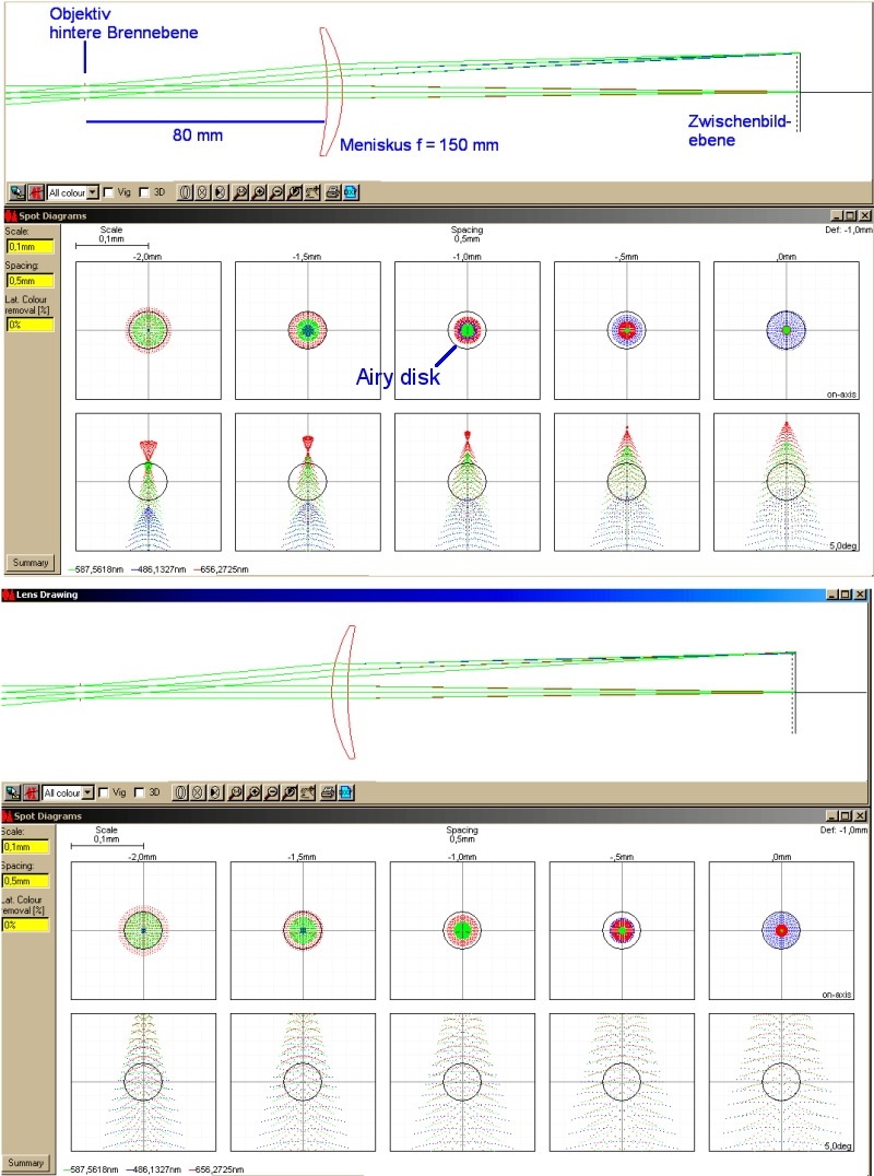 Ob Meniskus oder Plankonvex in der Bildmitte bleibe ich mit dem Spotdiagramm unter der Airy disk. Aber in der Bildmitte kann es auch keine Fehler durch CVD, Bildfeldwölbung oder Koma geben. Wie ich die Linsen auch drehe, welche Gläser auch eingesetzt werden, es bleibt ein Murks !!!  Nikon hat 4 Linsen für ein gutes System genommen.