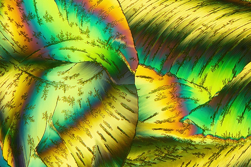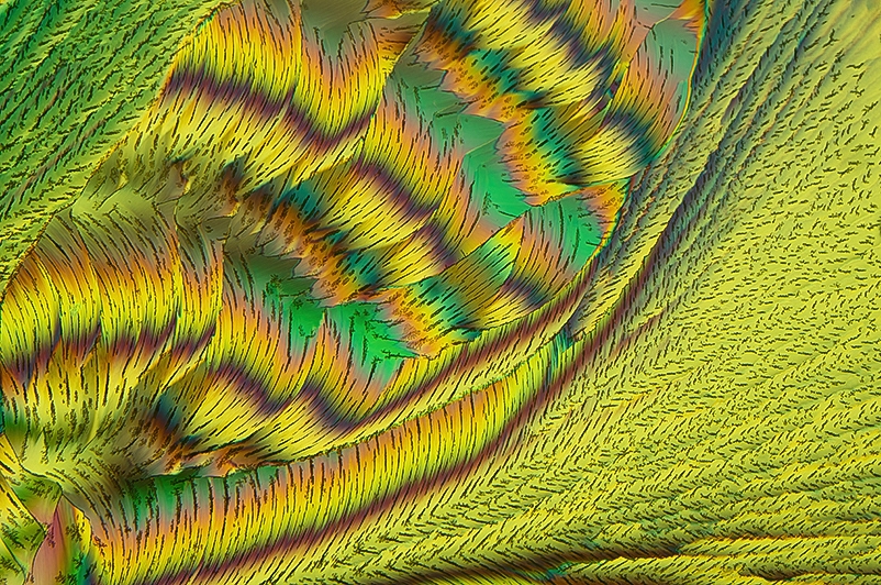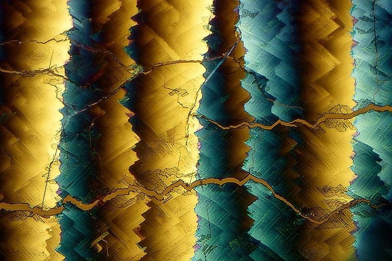 Bzgl. Mischungen: Bei 2-Komponenten-Gemischen kann es zur Bildung eines sogenannten Eutektikums kommen. Das ist eine Phasenzusammensetzung, deren Schmelzpunkt unterhalb der Schmelzpunkte der beiden Komponenten (in Deinem Fall Paracetamol und Bernsteinsäure) liegt. Bei der Erstarrung der eutektischen Mischung kann es zu solchen Mustern kommen, die Du zeigst. Das könnte also Deine Aufnahmen erklären.