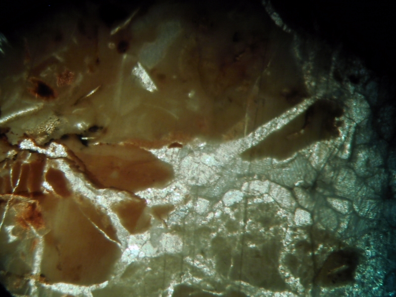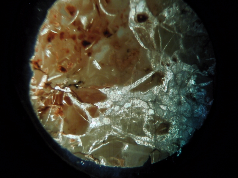 Ich habe mich auch mal etwas gespielt und einen Rotkalk bearbeitet. Da hatte ich einen Bohrkern gefunden. Das polarisierte Licht brachte wenig Effekt aber zumindest hab ich den Stein recht schnell auf eine Dicke gebracht wo ich mit Durchlicht bei hundertfacher Vergrößerung noch halbwegs fotografieren konnte. Hier schnell meine ersten Ergebnisse.