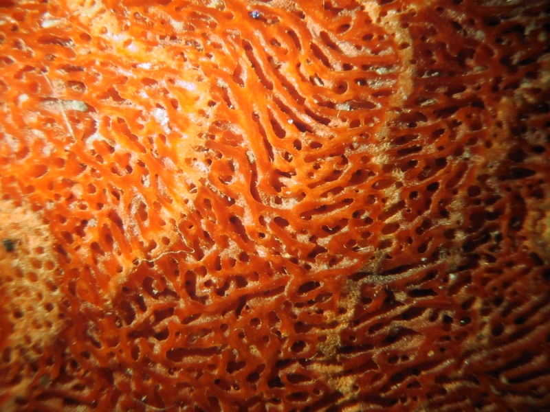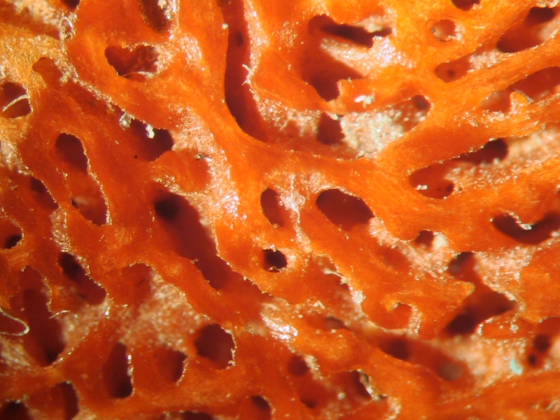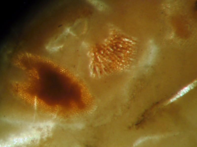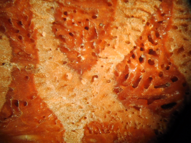 Ich weis auch nicht was das alles für Einschlüsse sind. Ich dachte an Korallen aber das untere Bild hat ca. 100-fache Vergrößerung und da kommen mir die Röhrengänge eigentlich zu klein vor. Ich bin aber auch kein Korallenexperte. Ich habe aber zum Vergleich mal Bilder einer roten Koralle gemacht.