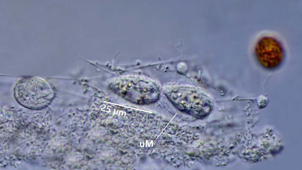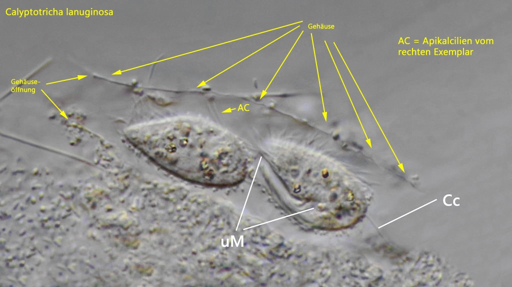 Der gezeigte Ciliat ist nicht Pseudocohnilembus pusillus, sondern Calyptotricha lanuginosa. Zum einen ist die UM für Pseudocohnilembus zu lang. Aber das wichtigste Kriterium ist das Gehäuse, in welchem sich die beiden Exemplare (nach einer Teilung) befinden. Diese Art von Gehäuse baut nur Calyptotricha. In der Mitte des Bildes sind zudem zwei Cilien zu sehen, bei denen es sich um die Apikalcilien (AC) des rechten Exemplares handeln könnte. Ich habe mir erlaubt, eines Deiner Bilder zu beschriften: