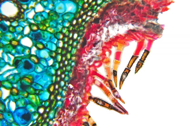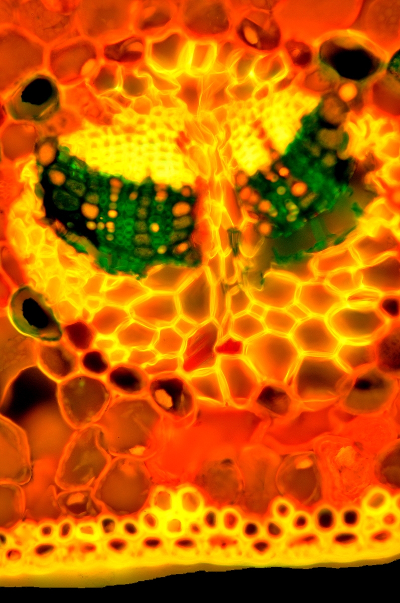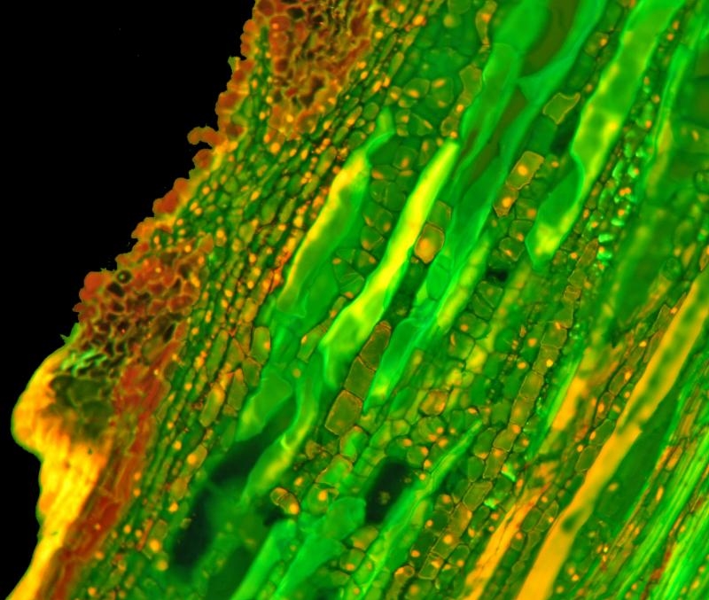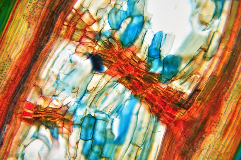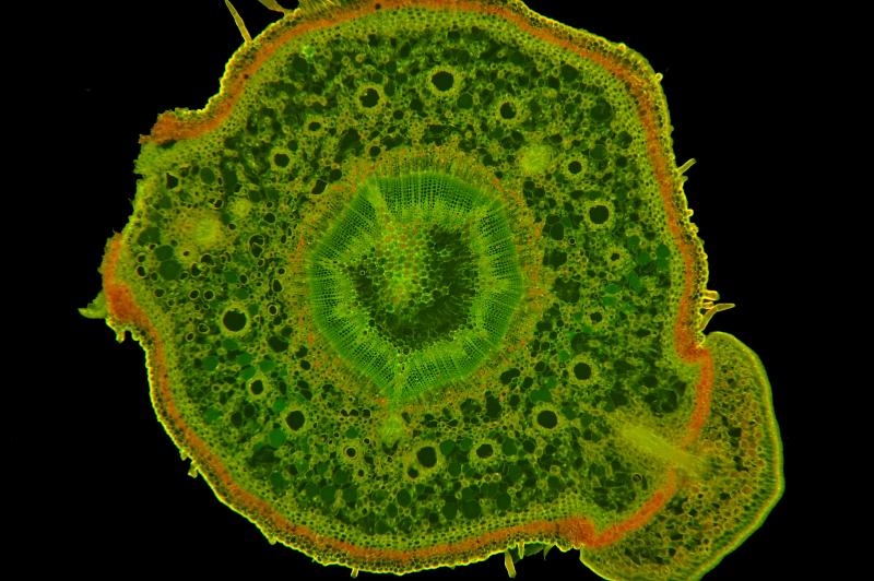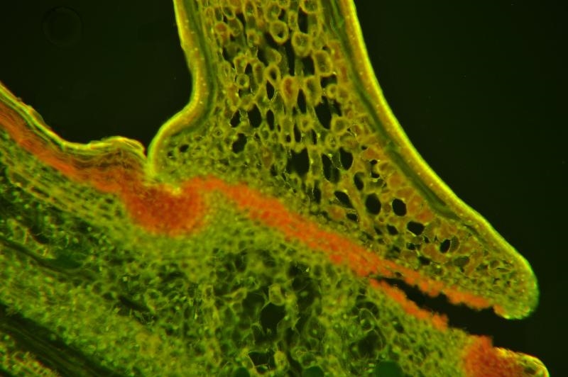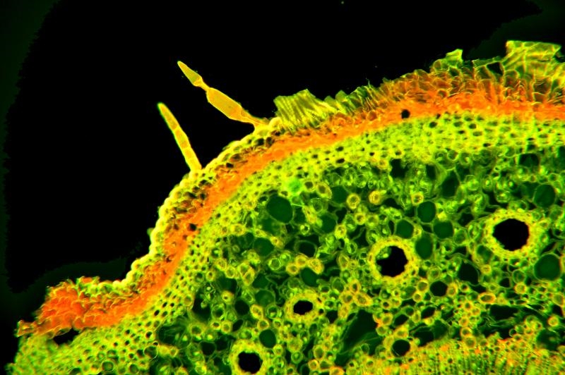 Zellwände blaugrün bis grün, verholzte Zellwände leuchtend rot, Zellwände der äußeren Hypodermis orangerot, Cuticula gelb, Zellwände der innenliegenden Hypodermis tiefrot.