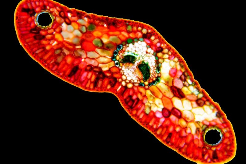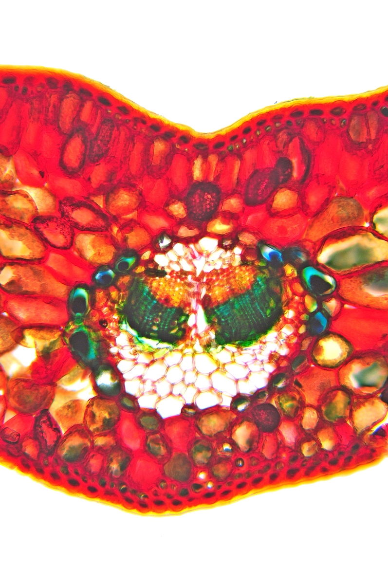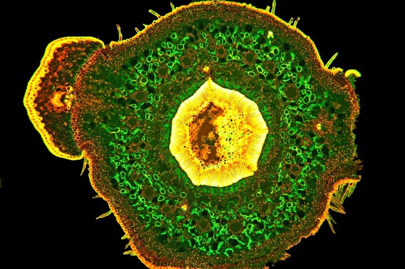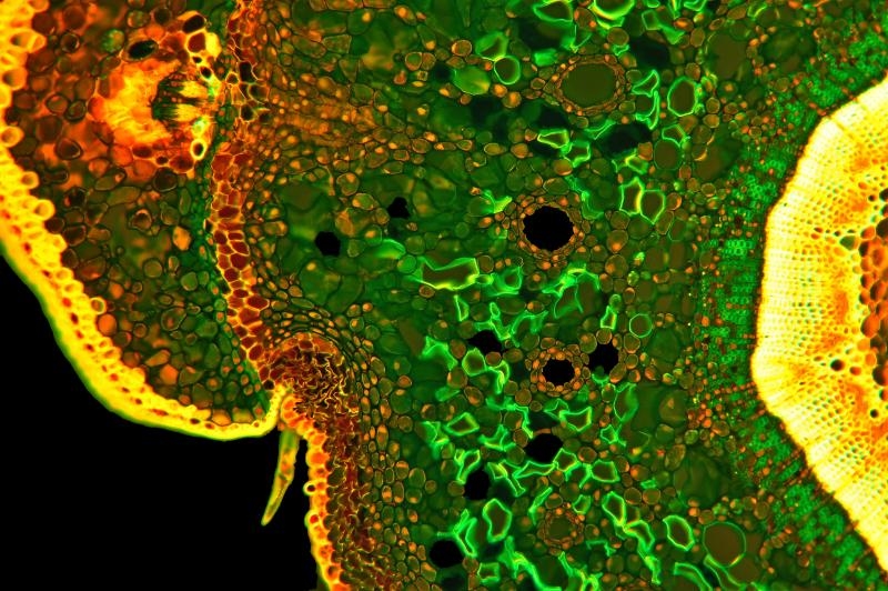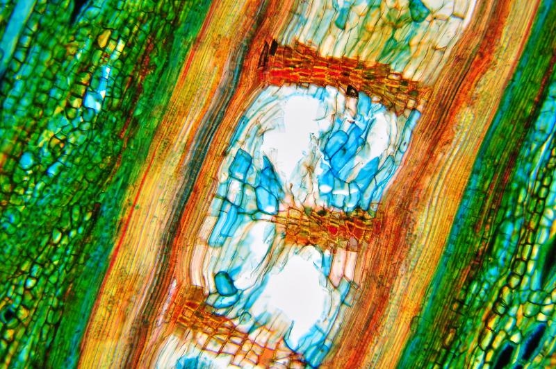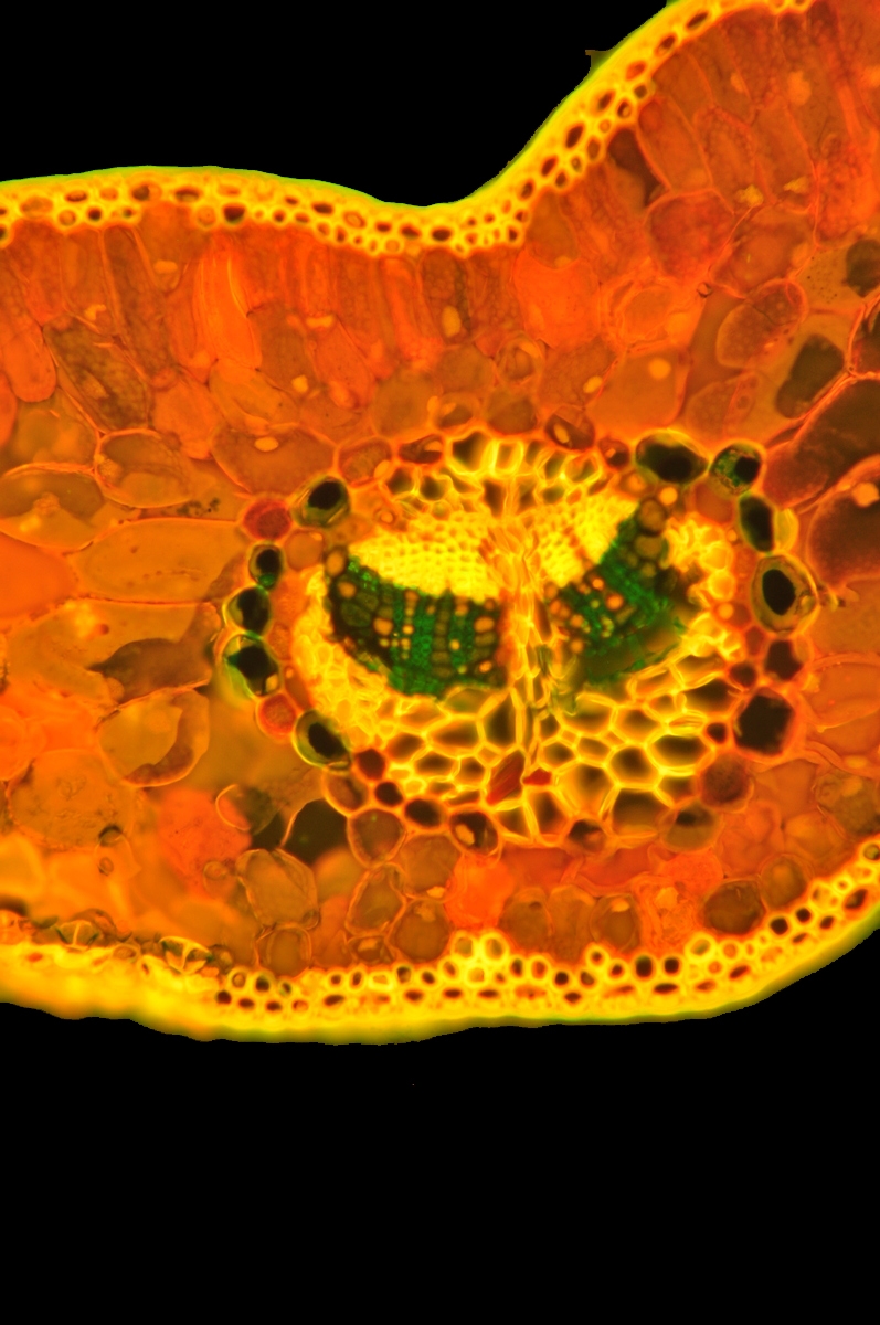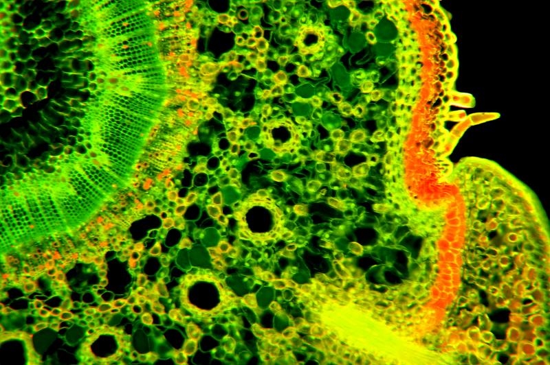 Zellwände blaugrün bis grün, verholzte Zellwände leuchtend rot, Zellwände der äußeren Hypodermis orangerot, Cuticula gelb, Zellwände der innenliegenden Hypodermis tiefrot.