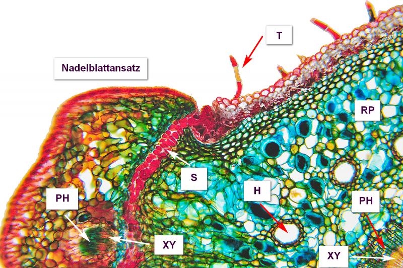 PH = Phloem, XY = Xylem, T = Trichom, H = Harzkanal, RP = Rindenparenchym, S = Sollbruchstelle (Abszissionsgewebe)