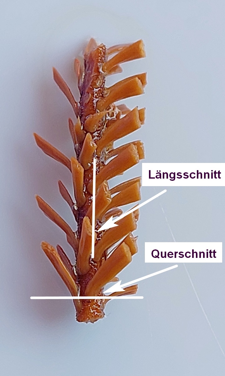 Spross, mit Ansätzen von Nadelblättern, Längsschnitt