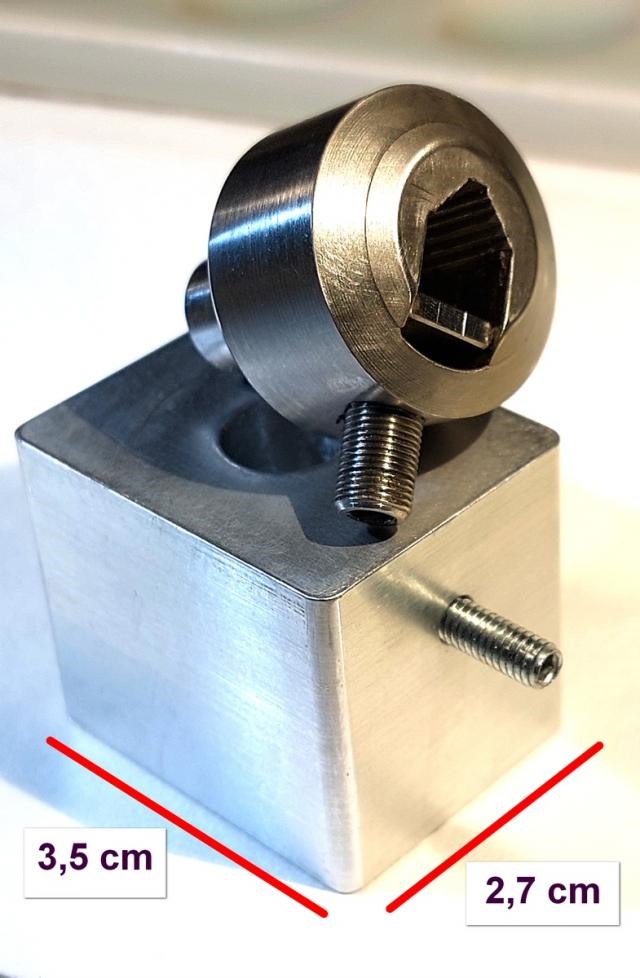 Der Alu-Block ist in Eigenleistung (sägen, Kanten glätten, 2 Bohrungen und Gewinde schneiden) erstellt.