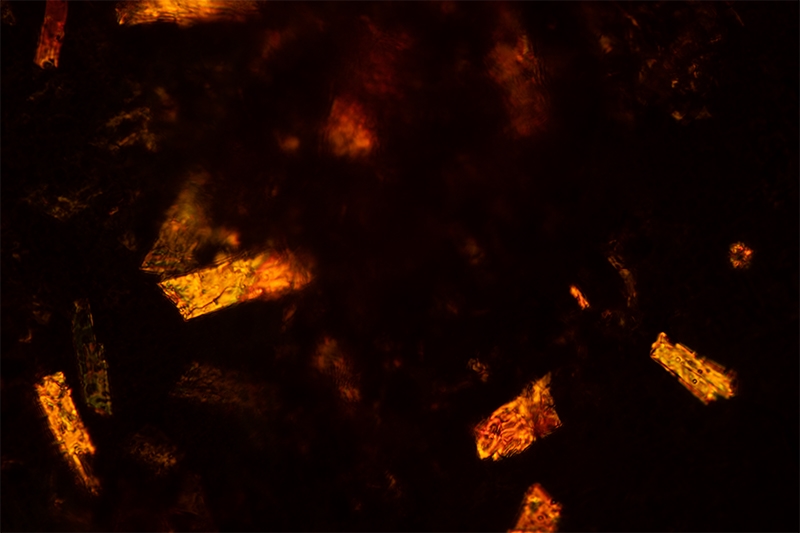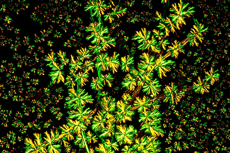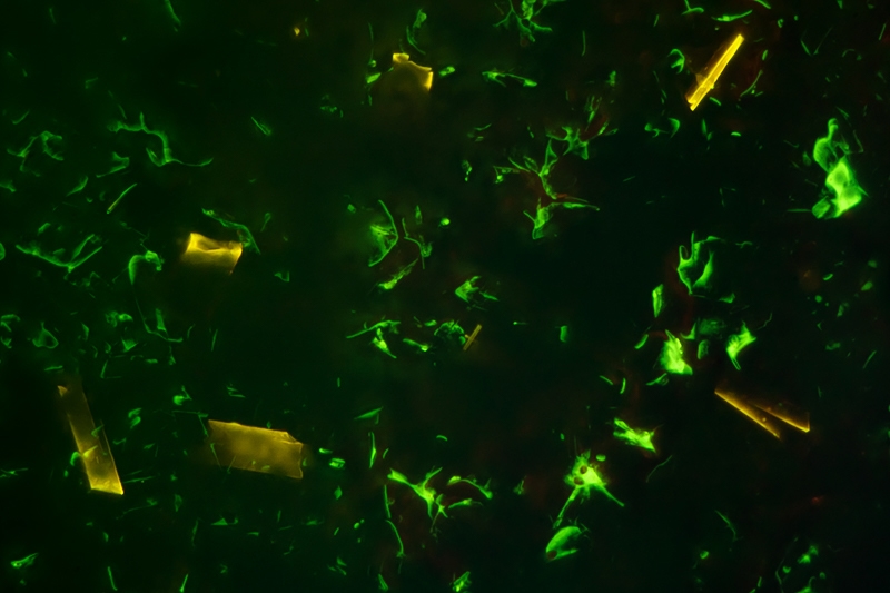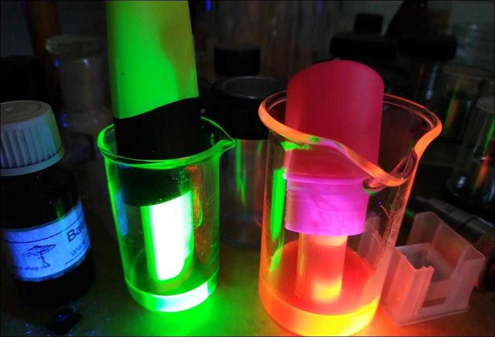Nun bin ich, mehr oder weniger durch Zufall, darauf gekommen, dass einige der Substanzen, die ich sonst für diese Pol-Fotos verwende, im UV- oder Blaulicht fluoreszieren.