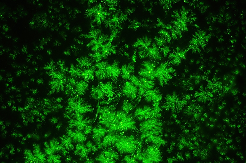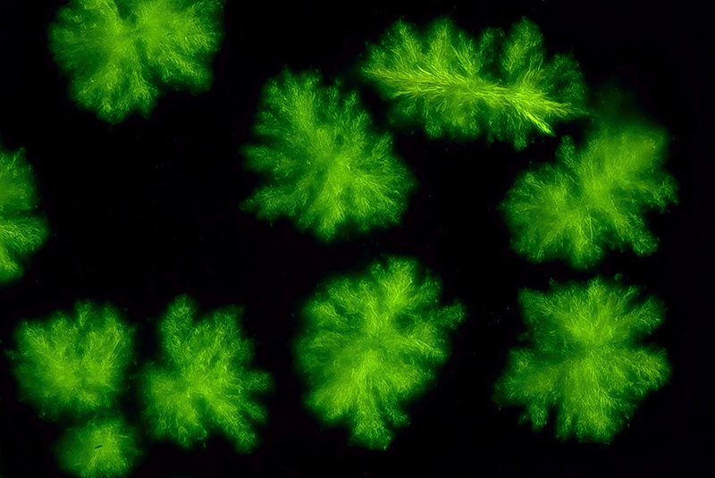 also das Textliner-Pyranin raubt mir noch den letzte Nerv. Angestachelt durch deine Bilder habe ich versucht, Ähnliches zu erreichen. Aber ich habe bestimmt zehn OT auf unterschiedliche Weise mit dem gelben Farbstoff versehen (Konzentration der Lösung, Verteilung auf dem OT, Temperatur und Dauer des Eintrocknens..). Aber es haben sich fast keine Kristalle gebildet, vereinzelt mal kleine Sternchen...