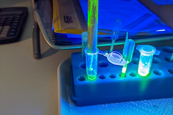 Da mein ,,Fluorescent dye starter kit" auch Fluorescein enthält, habe ich das gleich mal angeschaut. Trotz der kräftigen gelben Farbe, war nach dem Eintrocknen auf dem OT im UV-Licht nicht viel zu sehen: