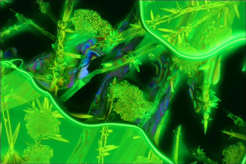 Hier sind nun ein paar Bilder von mir, im polarisierten Licht oder mit UV-Anregung. Bildbreite 0,22 mm bis 0,65 mm.