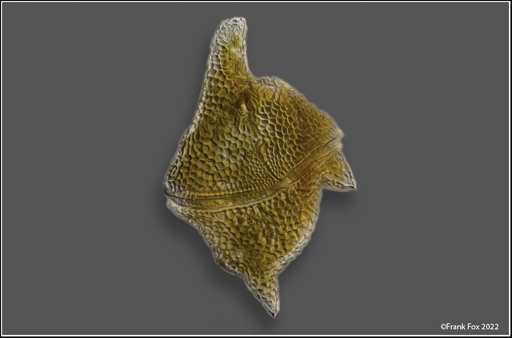 das Bild der Ceratium cornutum besteht aus vielen Einzelaufnahmen, also Focus-Stacking.