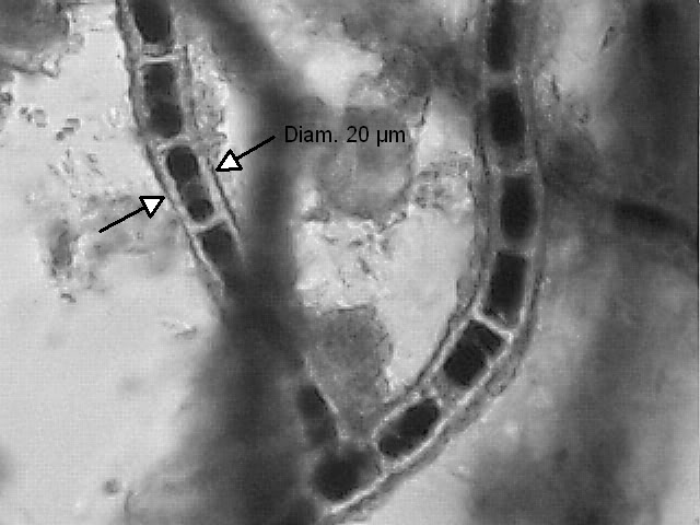 Auf Rinde einer verstorbenen Tanne, zwischen zahlreichen Lichenen-Arten und Lebermoosen (Lophocolea bidentata, Nowellia curvifolia) wuchs ein weniger als 1x1x1 mm groses Gebilde: Eine verzweigte fadenförmige Alge, die Zellen mit zwei orangen Einschlüsse welche mit Jod dunkel färben. Durchschnit der Zellen, sehe Pfeile, liegt bei 20 µm. Kann jemanden Näheres dazu sagen? Stimt meine Vermutung daß es sich um eine Art Trentepohlia handelt?