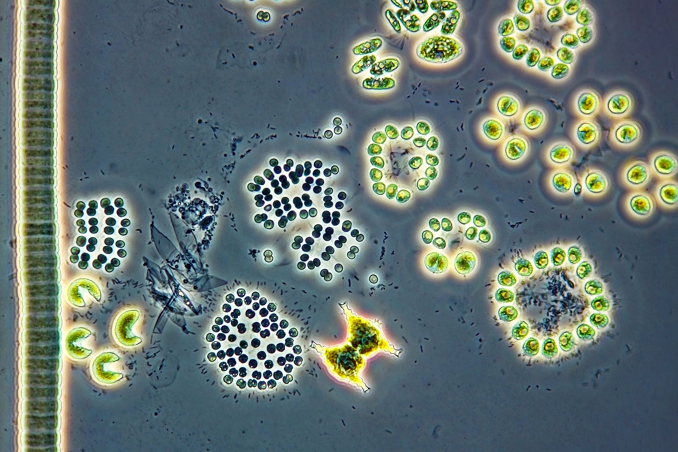 Mehrere verschiedene Gruppen von Algen. Nicht ganz so aktuell wie die beiden anderen Fotos, die ich gepostet habe, aber die Vielfalt gefällt mir sehr. Aufgenommen mit einem Ph2 40x/0,75 Neofluar-Objektiv.