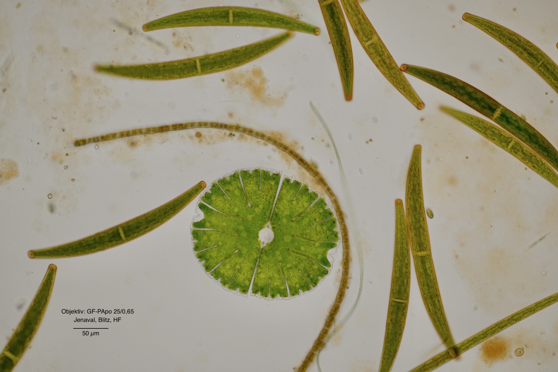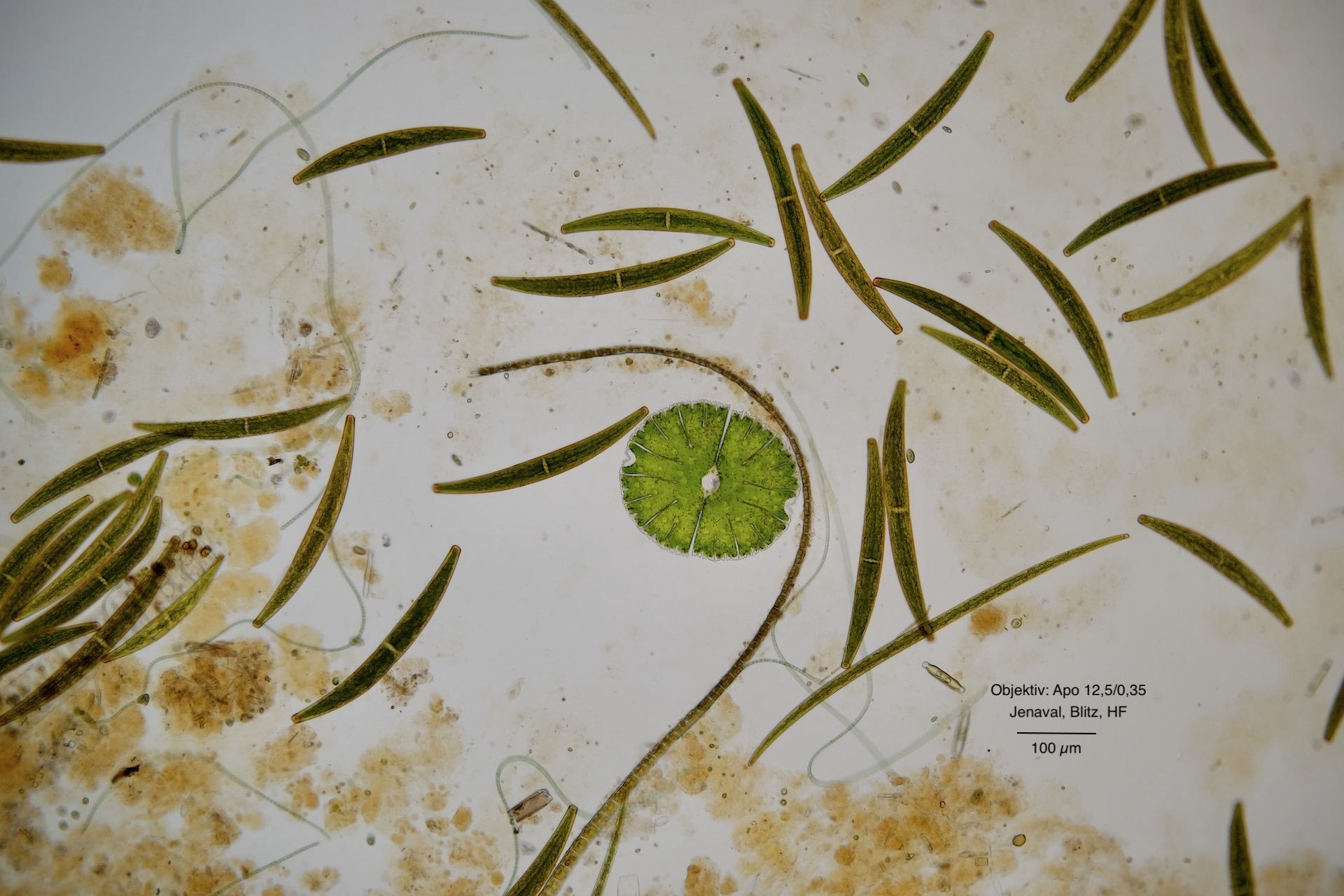 Was bei den Zieralgen oft auch ganz gut kommt: teilweise gekreuzte Polarisatoren. Die Zellulosehüllen der Zieralgen polarisieren sehr schön. Hier hatte ich das mal gezeigt, aber mit richtig gekreuzten Polfiltern. Das Biotop war das Gleiche.