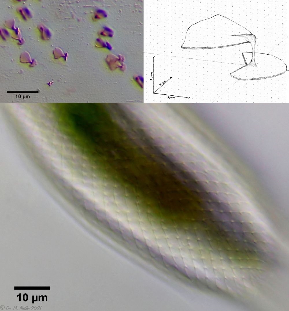 Im Querschnitt ist der doppelte Aufbau der extrem kleinen Stielschuppen deutlich. Die Basisplatten, deren Form nicht festgestellt werden konnte, haben lediglich eine Durchmesser von 1,1µm. Auf diesen erhebt sich ein 0,75µm hoher Stiel, der eine ungekielte, proximal abgerundetete Endplatte mit einer Kantenlänge von 3,6 µm trägt.