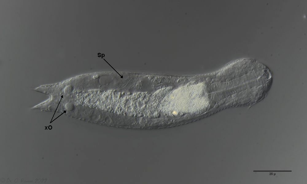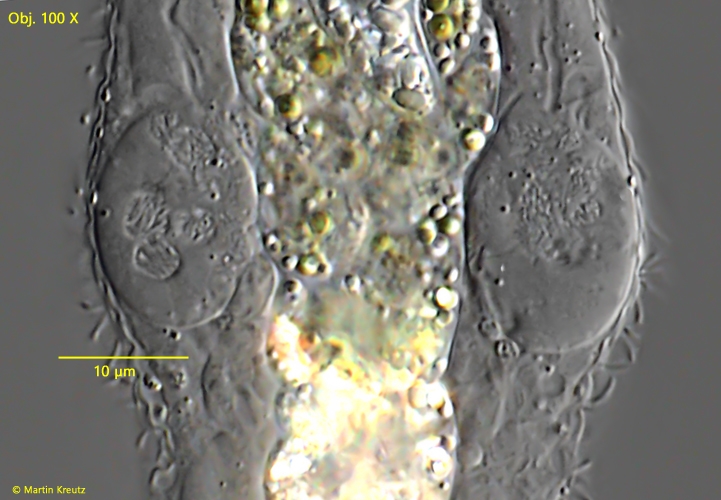 Ungewöhnlich ist, dass diese Spermotocyten in einem deutlich abgegrenzten Organ gebildet werden - sowas habe ich noch nicht gesehen. Auch fehlt das für die postparthenogenetische Phase typische X-Organ, das normalerweise noch vor den Spermien gebildet wird und das wohl eine "Hilfstruktur" (z.B. Drüse für Pheromone o. Ä.) für die sexuelle Fortpflanzung bei limnischen Gastrotrichen darstellen könnte. Dieses X-Organ ist meiner Beobachtung nach sehr artspezifisch und ist bei einigen Arten durchaus sehr ungewöhnlich ausgebildet. Es kommt meist als eine zweiteilige, kugelförmige Struktur vor (wie in einigen obigen Beispielen gut zu sehen). Manchmal findet man (bei alten Tieren) auch 4 Kugeln. Einige Arten (z. B. Chaetonotus arquatus - https://www.mikroskopie-forum.de/index.php?topic=41645.0) haben ein einteiliges X-Organ, das bereits beim Schlupf - also in der parthenogenetischen Phase - vorhanden ist. Man könnte jetzt spekulieren, ob bei Deinem Fund die Spermatogenese nicht direkt in einem speziellen X-Organ stattfindet...