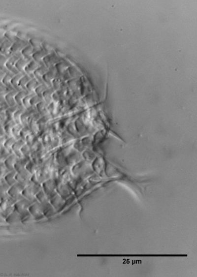 Besonders interessant finde ich den vermutlich unbeschriebenen Aspidiophorus (die zweite vorgestellte Art). Ich habe von diesem Gastrotrichen in meinen mitgebrachten Proben aus dem Sima-Moor auch einige Exemplare gefunden und ebenfalls festgestellt, dass der Schuppenpanzer weit von der Epidermis abgelöst zu sein scheint. Ganz so, als ob eine Vorstufe von Häutung vorläge - die gibt es natürlich bei den Gastrotrichen nicht. Kannst Du Dir das von der Feinstruktur her erklären - oder handelt es sich vielleicht doch um ein Artefakt der Präparation?