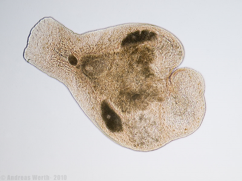 ich halte dieses Viech ebenfalls für einen Strudelwurm/Turbellarie . Nur um Missverständnisse auzuschließen: Im oberen Bild ist der Kopf rechts, im 2. links, im 3. ist der Kopf zu sehen. Bei einigen Turbellarien gibt es im Vorderteil einen Stilettapparat, z.B. bei den Rhabditophora. Das ist vielleicht der "Dorn". Des weiteren kann man ganz gut die paarigen Darmdivertikel sehen . Insofern spricht einiges dafür.