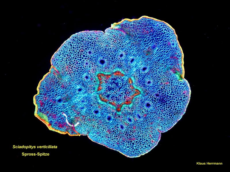 zum Thema Coniferen habe ich aus der Reihe "Schirmtanne" einen etwas anderen Blick gewählt: es ist ein Schnitt durch die Basis einer Sprossspitze, in der schon das nächste Nadel-Bündel angelegt ist. Die Löcher (Harzkanäle) gehören immer paarweise zu einer Nadel.Bei 8 und 2 Uhr sind Hüllblätter angeschnitten.