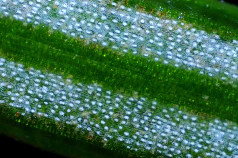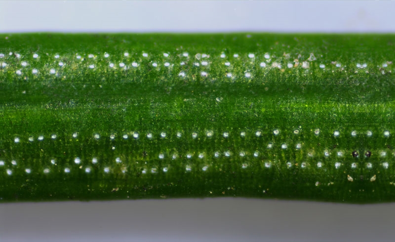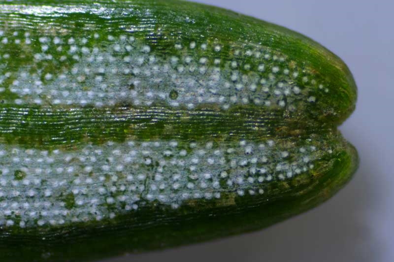 Foto Nr. 1: Unterseite der Spitze einer Tannennadel. Man sieht eine Wachsschicht. Die weissen Punkte weisen auf den Ort der Stomata hin. Die Spitzen der Tannennadeln sind stumpf, während die der Fichten richtig spitz sind und daher leicht stechen.