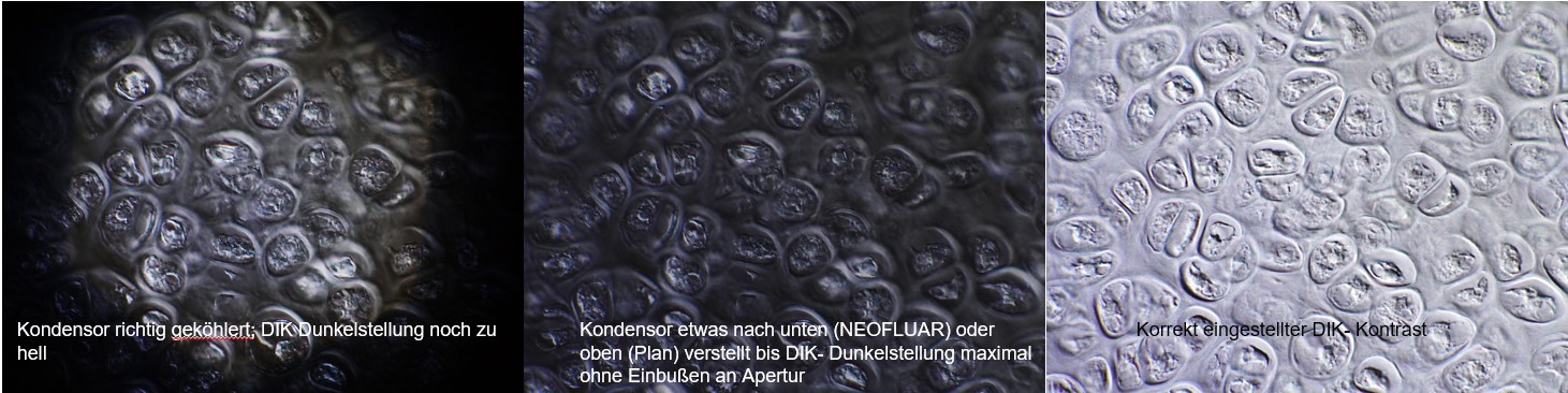 Vorgehensweise: Köhlern im DIK (Aperturblende zentrieren (!) und dann gleich/ etwas größer als die Objektivapertur eingestellt), DIK- Schieber auf maximale Dunkelstellung bringen, wenn DIK- Kontrast zu schwach ist, den Kondensor jetzt leicht absenken oder anheben, bis die Dunkelstellung maximal ist ohne JEDOCH DABEI die Bildgüte zu verändern, ggf. Leuchtfeldblende geringfügig mehr öffnen. Dann DIK- Schieber in die Stellung drehen, bei welcher der Kontrast als gut empfunden wird (nicht zu stark).