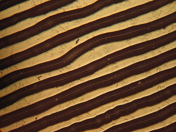 die Tonspur ist dunkel. Deren Oberfläche ist auch wesentlich glatter als die helle Plattenoberfläche.