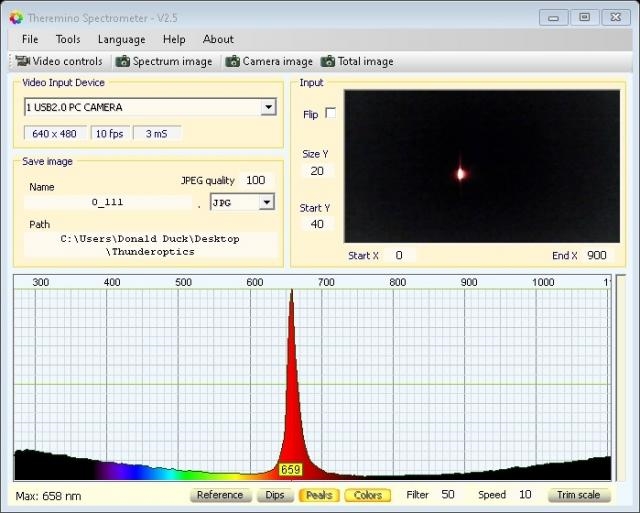 der Betriebs- und Anzeigemodus lässt sich gar nicht so einfach verstellen. Wie geschrieben, das Ding habe ich erst ein paar Tage. Ich gebe euch natürlich Recht, dieses Ding ist verglichen mit meinem Handspektrometer gewöhnungsbedürftig. Ich habe jetzt noch einmal eine einfache Taschenlampe und einen Laserpointer mit Wellenlängen zwischen 630 nm und 680 nm (im Mittel 655 nm) gemessen. Die Bilder hänge ich an. Das Ding scheint durchaus brauchbare Wellenlängen zu liefern.